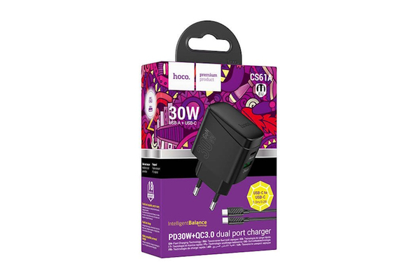 СЗУ на PD+USB HOCO CS61A QC3.0, PD30Вт + кабель Type-C, Type-C чёрный