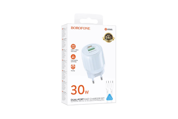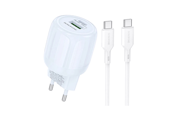 СЗУ на PD+USB Borofone BA94A, PD30Вт, QC3.0 + кабель Type-C - Type-C , синий